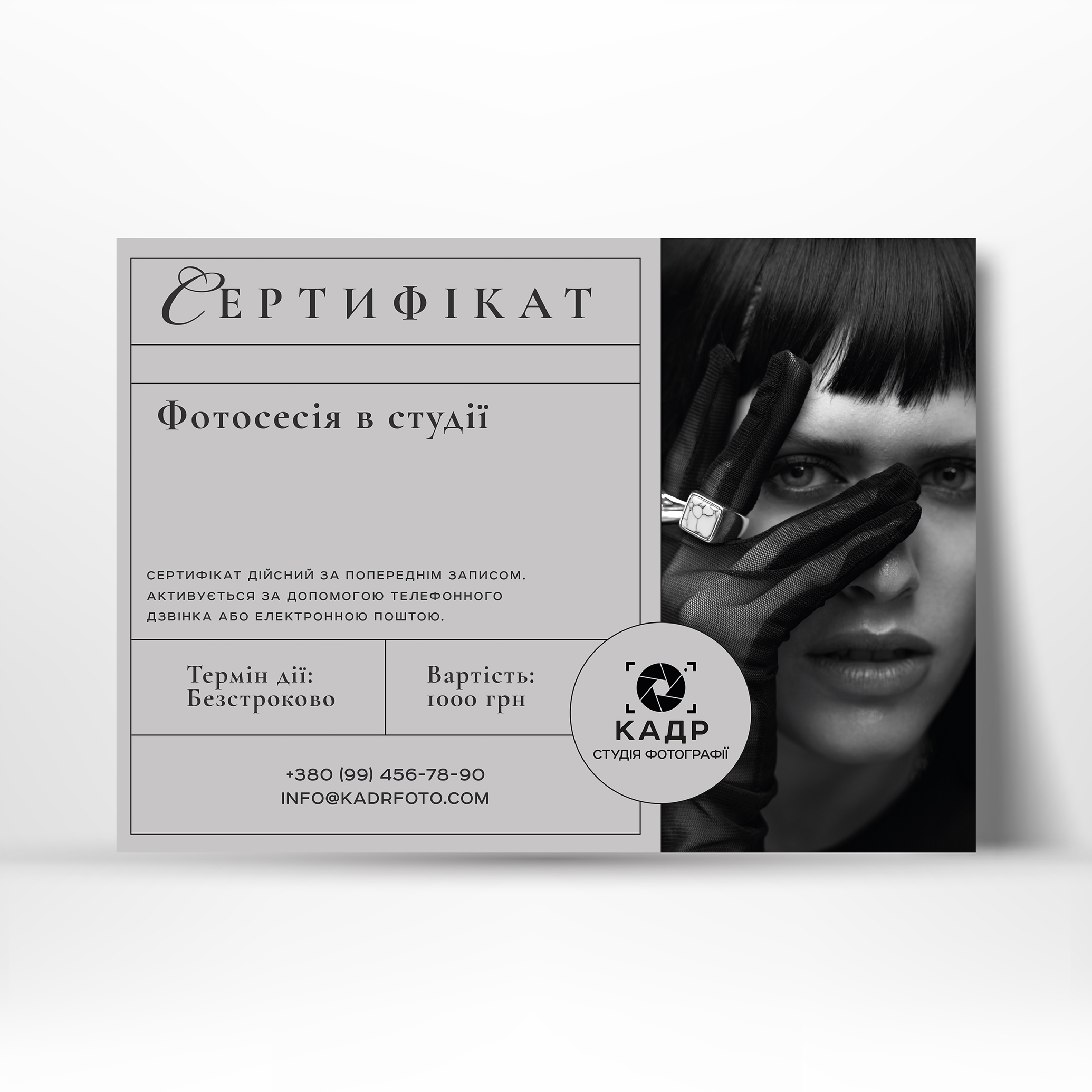 Подарочный сертификат, дизайн которого будет создаваться, должен содержать имя получателя, срок действия карты, контактную информацию, размер и сумму скидки, прочую информацию.