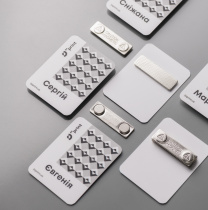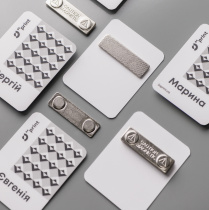 Металлические бейджи – самый презентабельный вариант именных бейджей. Такие бейджи используются для врачей и сотрудников статусных компаний. Преимуществом металлического бейджа является возможность изготовить бейджики для каждого из сотрудников отдельно, ведь бейджи можно изготовить с прозрачным окошком для смены фамилии, имени и отчества, а также должности. К минусам таких бейджей можно отнести цену, она выше, чем у пластиковых и бумажных. Для изготовления металлических бейджей также, как и для пластиковых требуется время. Сроки изготовления вы можете уточнить у менеджера непосредственно во время оформления заказа. Для крепления используют магнит или булавку.